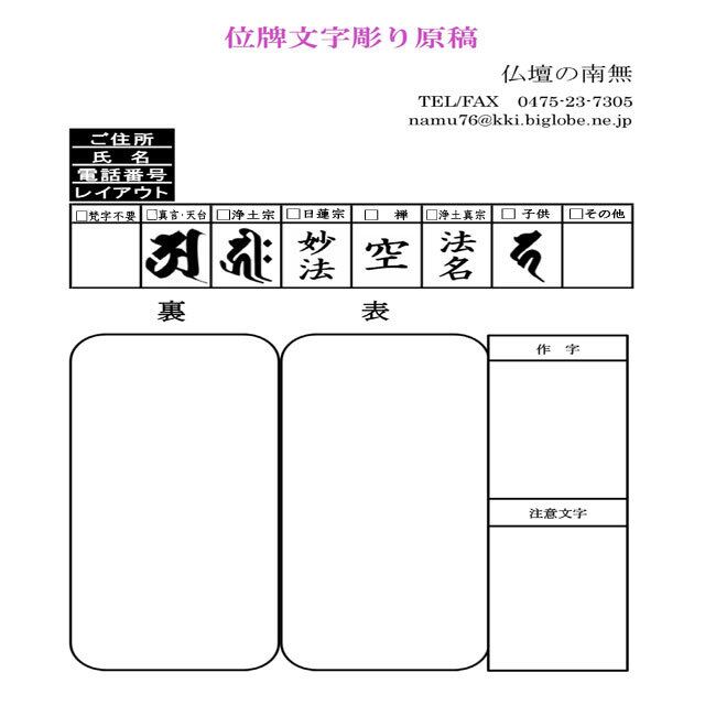 ・表に戒名 亡くなられた 年 月 日 裏に俗名・行年を お入れします。(無料) 購入された方は これからの下書きを ご連絡下さい「表に戒名 亡くなられた 年 月 日 裏に俗名・行年を記入し FAX メールで お送り下さい。